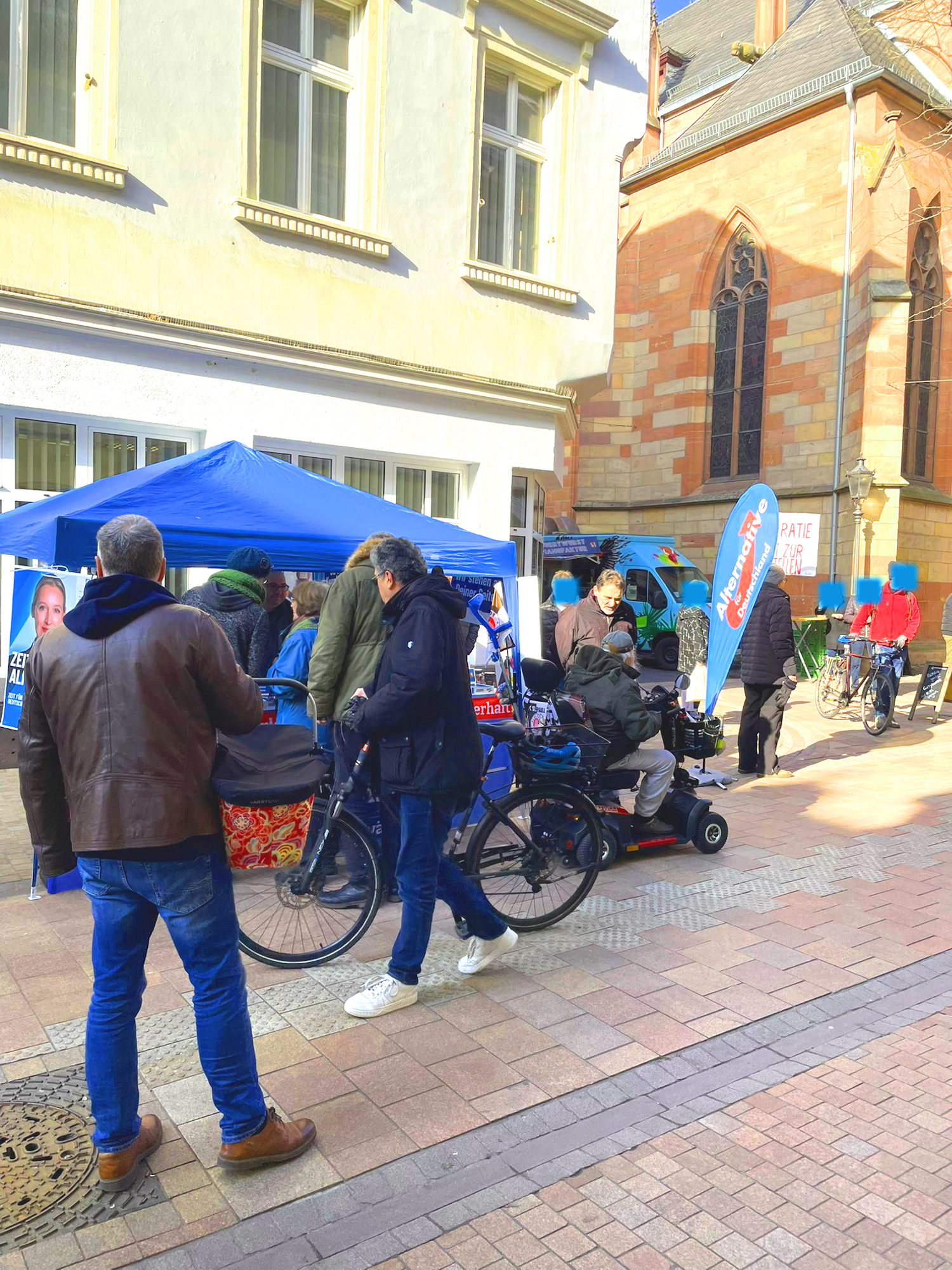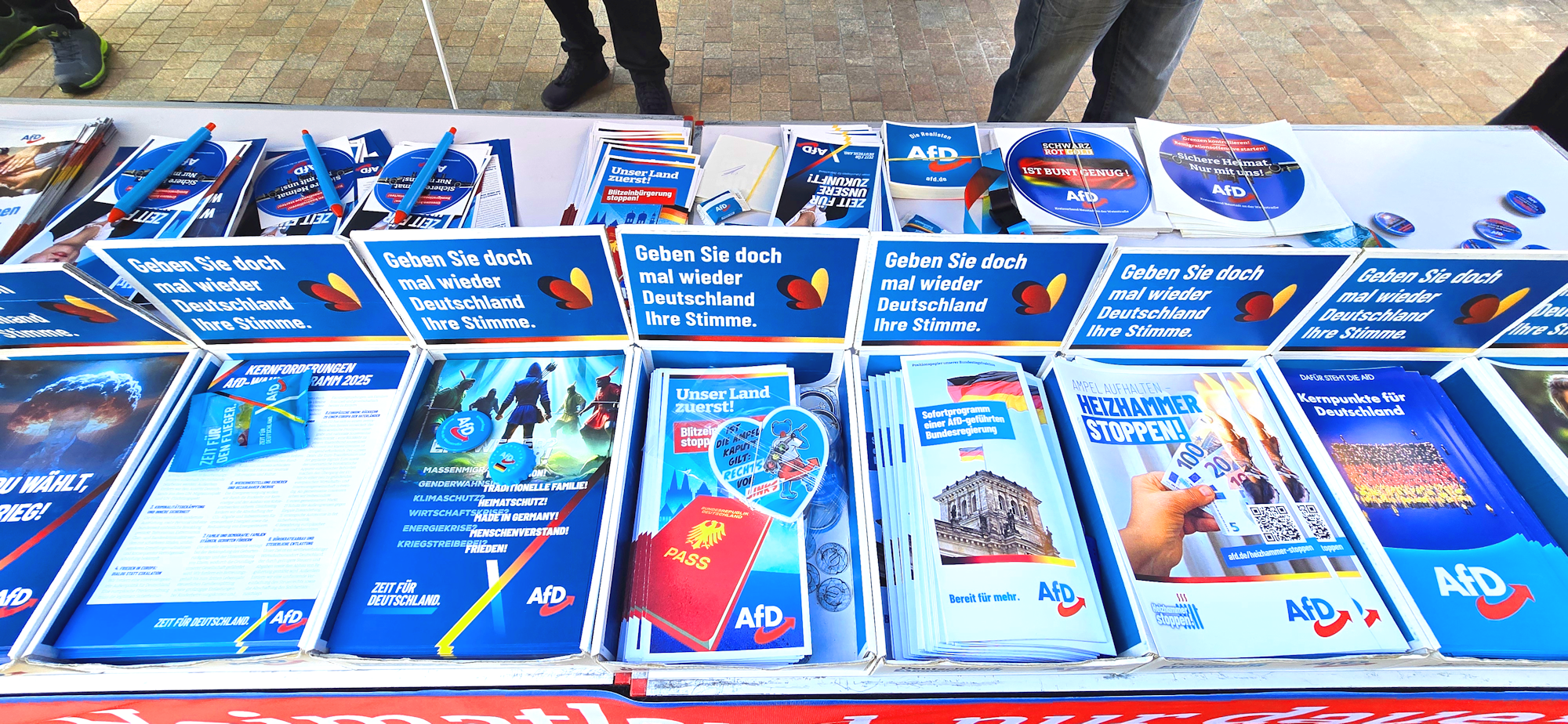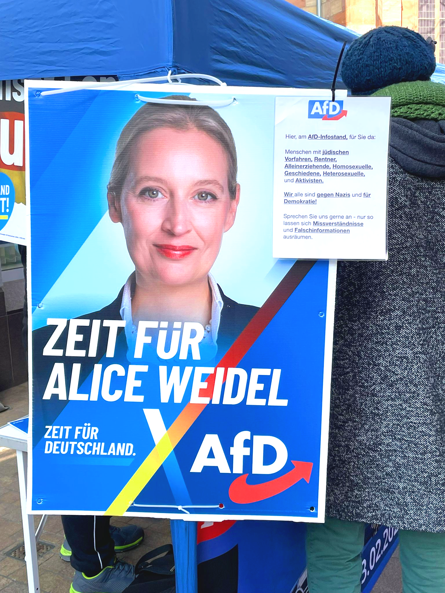 Trotz der Demonstration haben wir unseren Infostand wie gewohnt bis 14 Uhr fortgeführt. Wir lassen uns nicht einschüchtern und stehen weiter für unsere Überzeugungen ein – im Sinne einer demokratischen und zukunftsorientierten Politik für Deutschland.