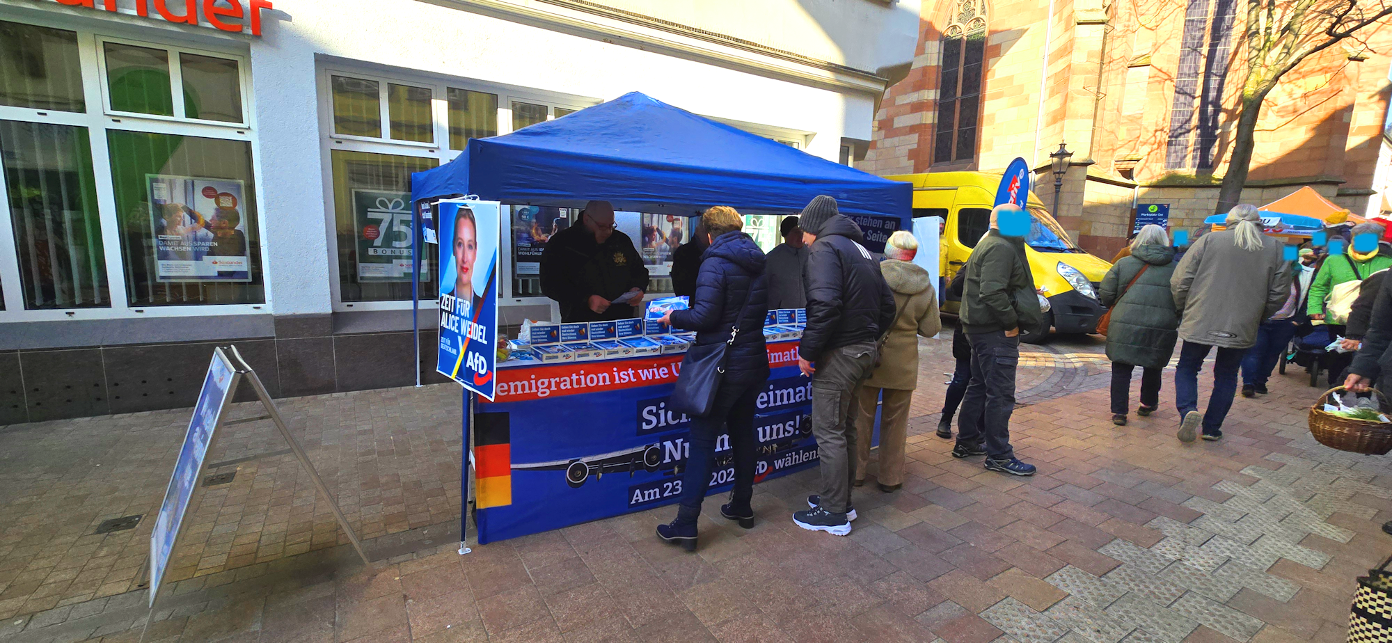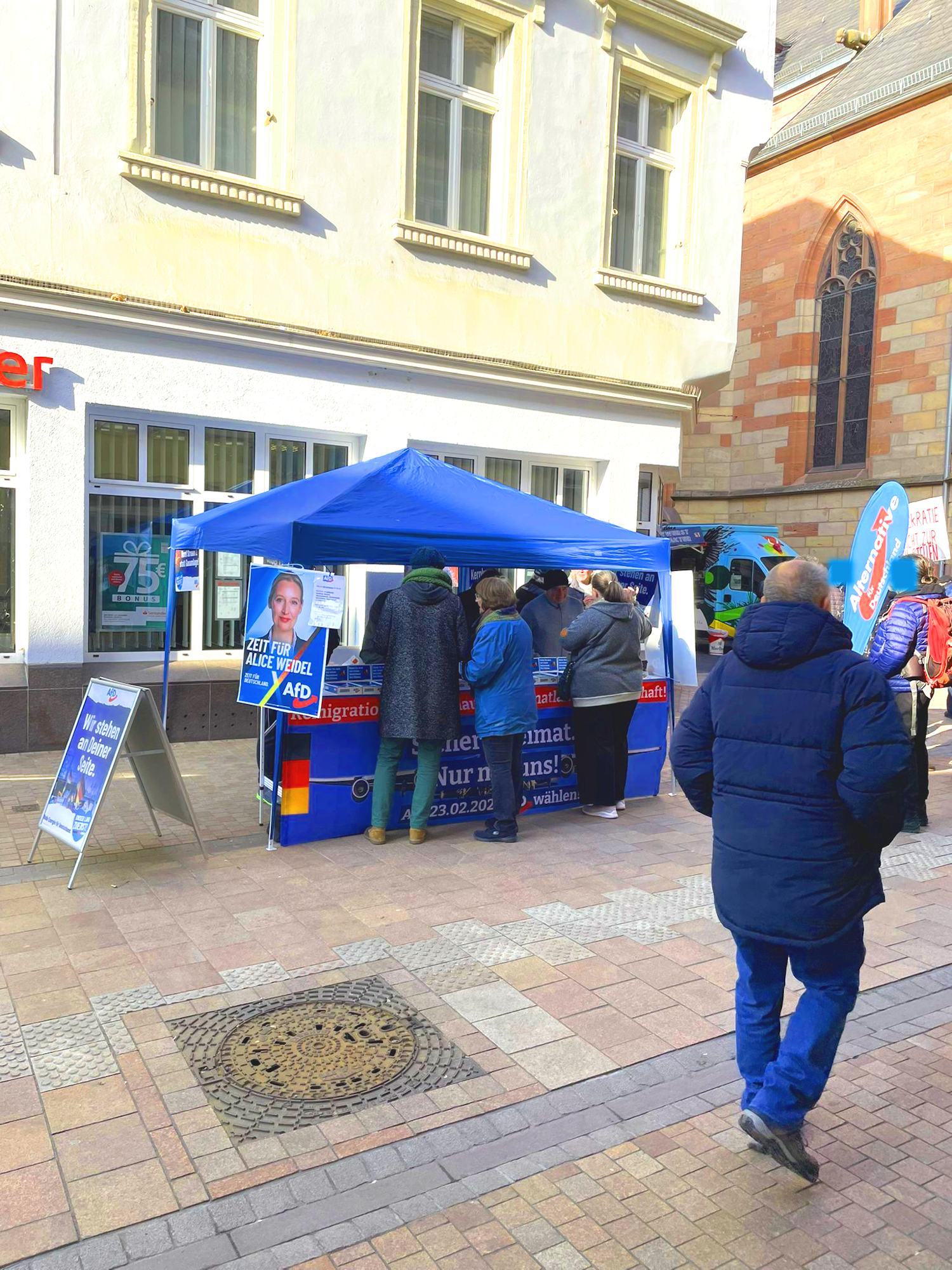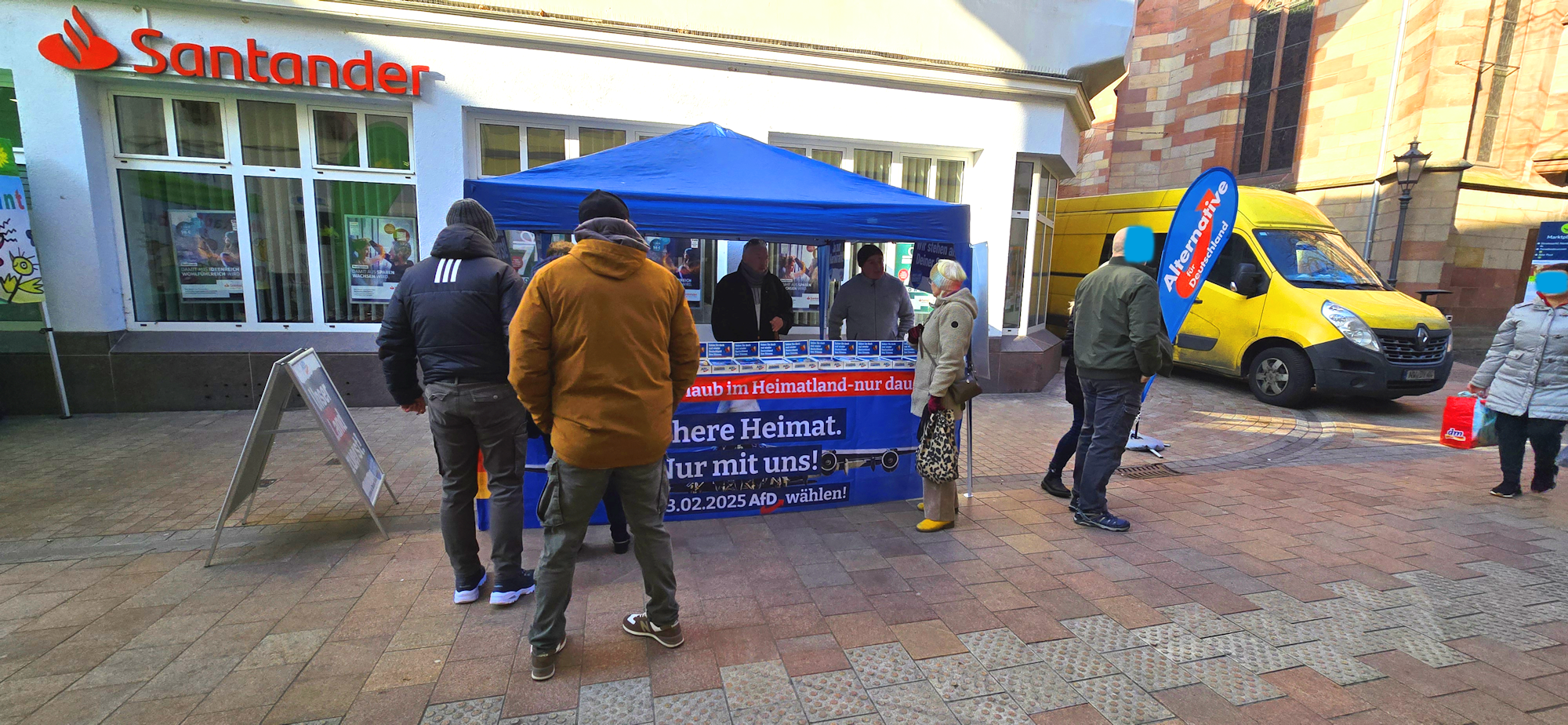 Unter diesem Motto waren wir heute mit einem Infostand in der Fußgängerzone von Neustadt zur Bundestagswahl vertreten. Trotz der Gegenpräsenz der "Omas gegen Rechts" und einer um 13:30 Uhr gestarteten Demonstration gegen Rechts zeigten viele Bürger großes Interesse an unserem Stand. Zahlreiche Menschen kamen vorbei, um sich über die wahren Ziele der AfD zu informieren – oder sich über die Gegendemonstranten zu beschweren.
