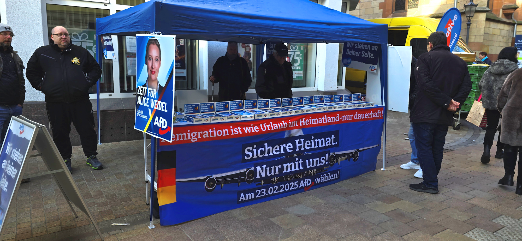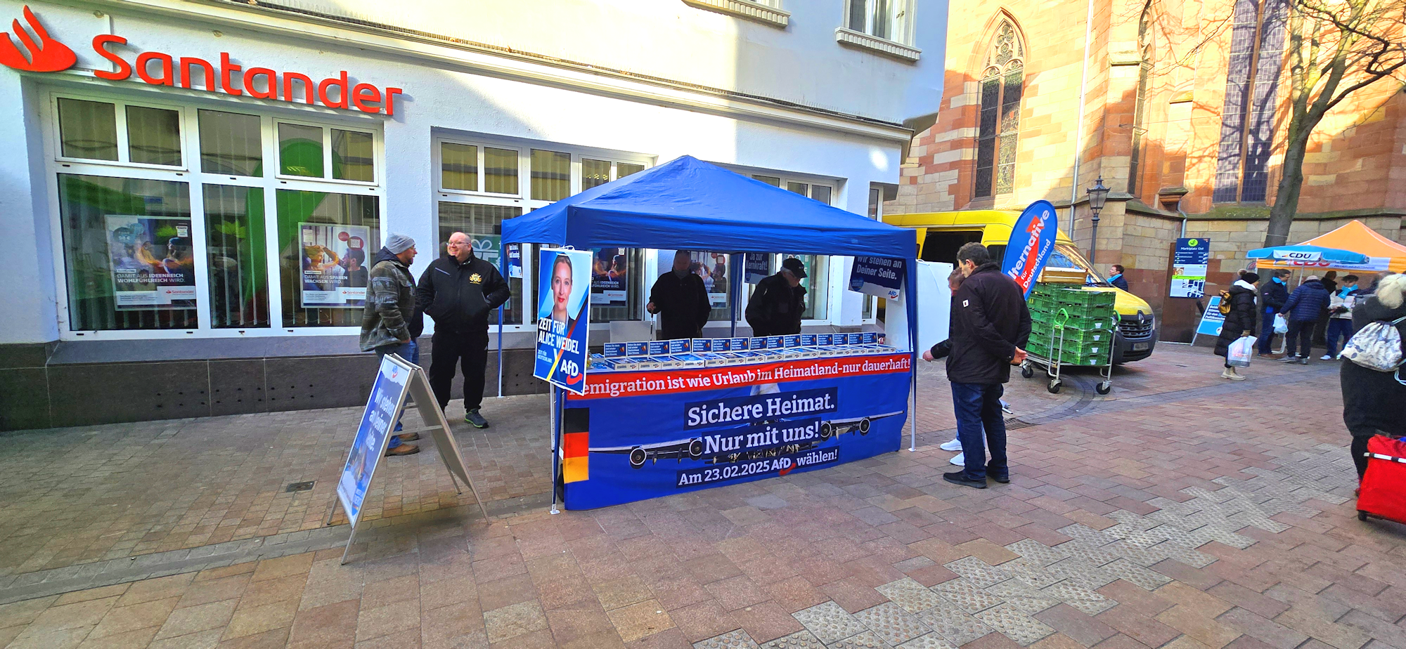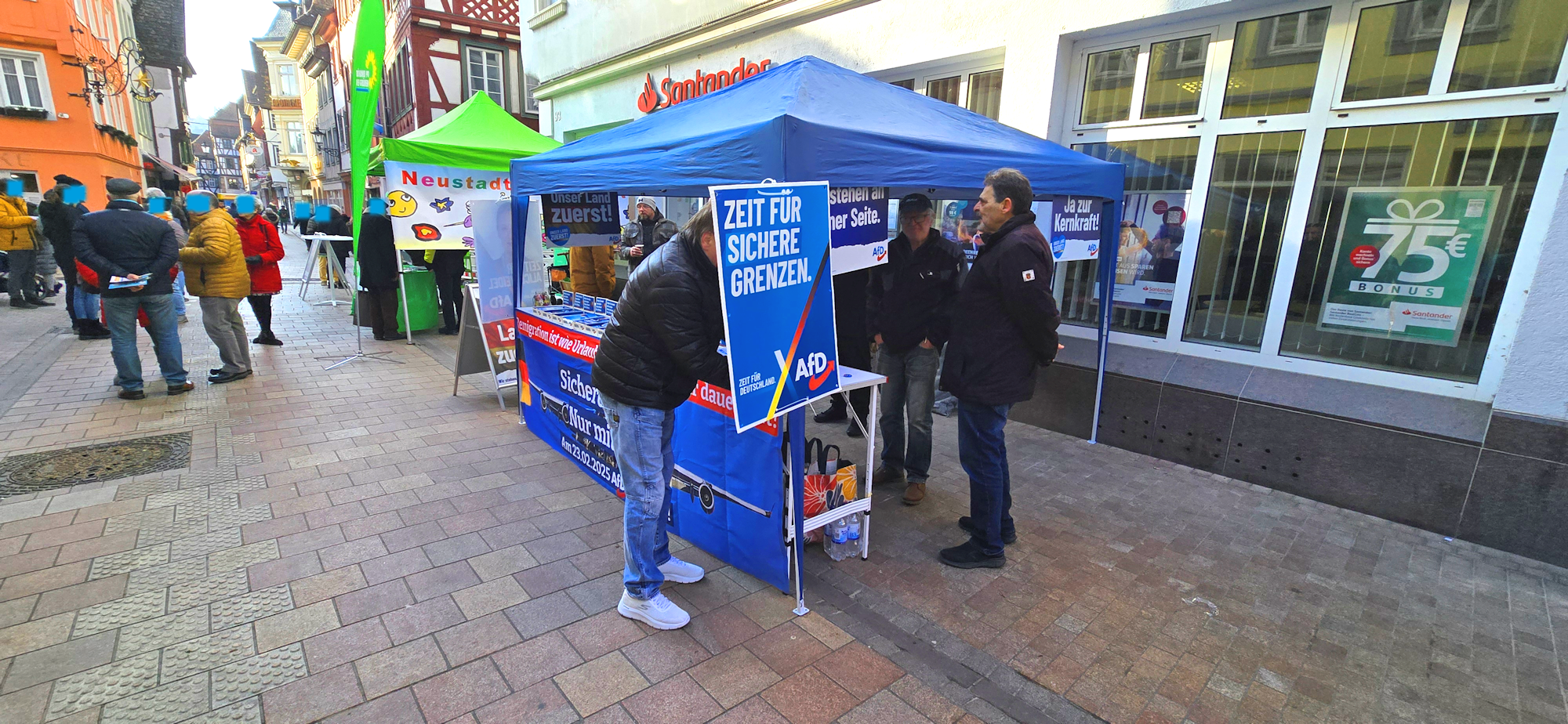 Unter diesem Motto waren wir heute mit einem Infostand in der Fußgängerzone von Neustadt zur Bundestagswahl vertreten. Trotz der Gegenpräsenz der "Omas gegen Rechts" und einer um 13:30 Uhr gestarteten Demonstration gegen Rechts zeigten viele Bürger großes Interesse an unserem Stand. Zahlreiche Menschen kamen vorbei, um sich über die wahren Ziele der AfD zu informieren – oder sich über die Gegendemonstranten zu beschweren.