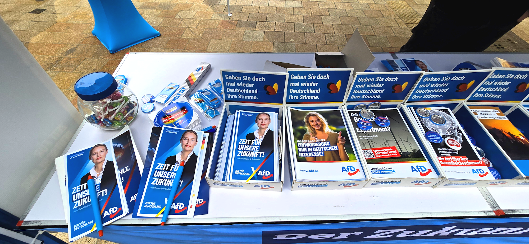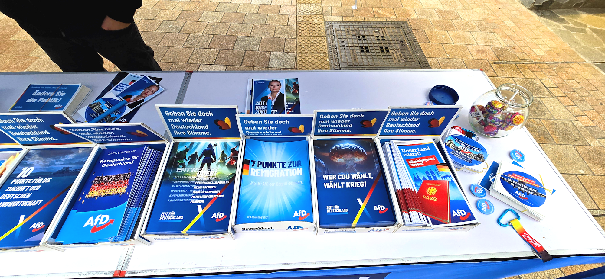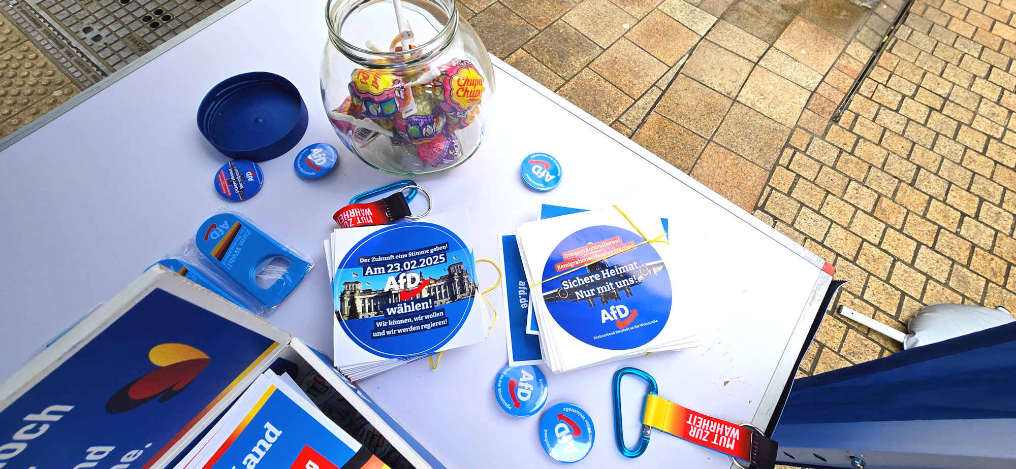 Besonders erfreulich war der Austausch mit einigen Jugendlichen mit Migrationshintergrund, die auf unsere Inhalte aufmerksam wurden und sich aktiv mit unseren Ideen auseinandersetzten. Sie sprachen uns unter anderem auf den Flyer unserer Parteifreunde aus Karlsruhe an (One-Way-Ticket), der das Thema Rückführung behandelt. Nach einer offenen und sachlichen Diskussion konnten wir Missverständnisse klären, insbesondere darüber, welche Gruppen tatsächlich von unseren Remigrationsplänen betroffen wären. Wir nutzten die Gelegenheit, um gezielt über unsere Vorschläge zur Migrationspolitik zu informieren und ihnen passenden Informationsmaterial an die Hand zu geben.