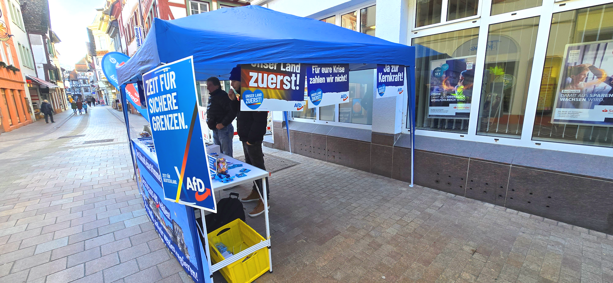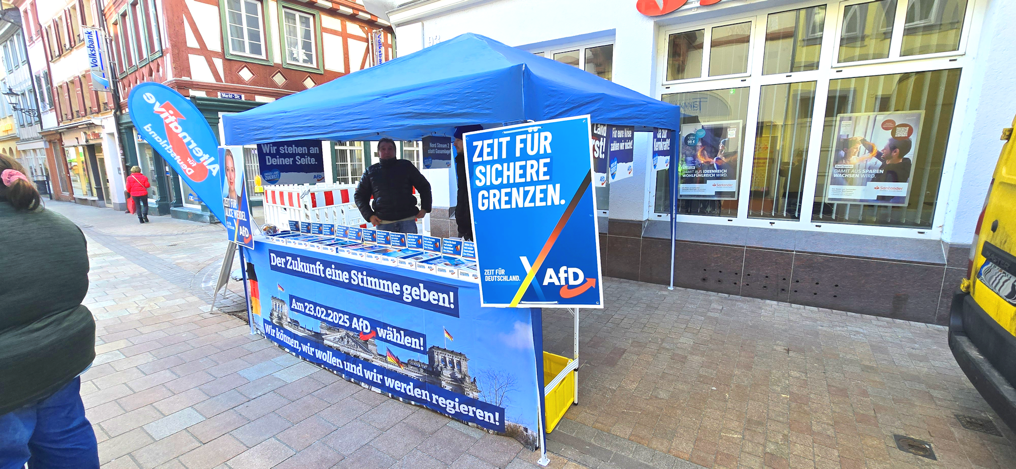 Heute waren wir erneut mit unserem Infostand zur Bundestagswahl 2025 vor der Santanderbank in Neustadt an der Weinstraße vertreten. Trotz einer zeitgleich stattfindenden Demonstration gegen Rechts konnten wir ein deutlich gestiegenes Interesse der Bürger an der AfD verzeichnen.